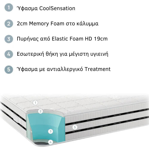 Το Advance είναι ένα στρώμα διπλής όψεως. Ο πυρήνας του είναι κατασκευασμένος από 100% higly elastic Foam. Κατάλληλο για όλες τις θέσεις ύπνου. Ο πυρήνας από 100% ελαστικό αφρό παρέχει σταθερή στήριξη κατά τη διάρκεια του ύπνου και η στρώση από Memory Foam προσθέτει απαλότητα και αγκαλιάζει το σώμα.
